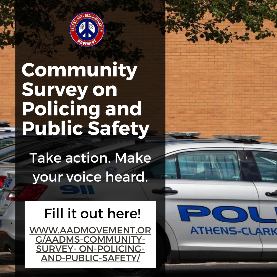 As we continue our work in justice reform advocacy, AADM wants to hear from the People in Athens on your experiences with police/law enforcement in Athens and what YOU want to see change. Please fill out this form so that we can work to improve public safety in our community. Your responses will be anonymous. AADM will be the only group to have access to it and we will be using it as raw data to demonstrate the community's feelings on policing and public safety. Your responses will be kept private and secure.